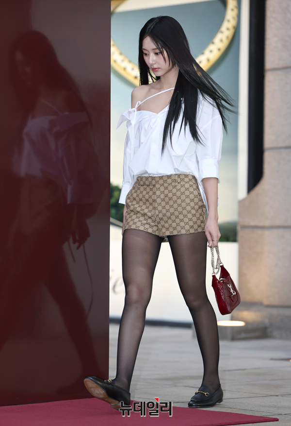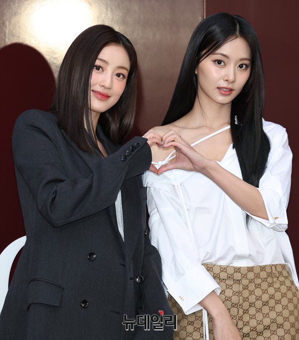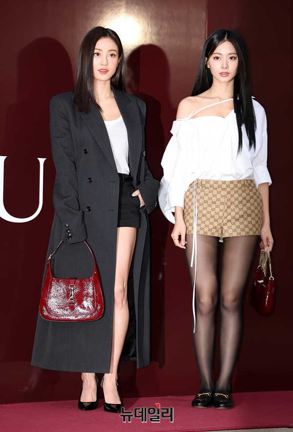 트와이스 지효와 쯔위가 5일 오후 서울 강남구 갤러리아백화점 명품관에서 열린 구찌 '앙코라(Gucci Ancora)' 팝업스토어 오픈 행사에서 포즈를 취하고 있다.