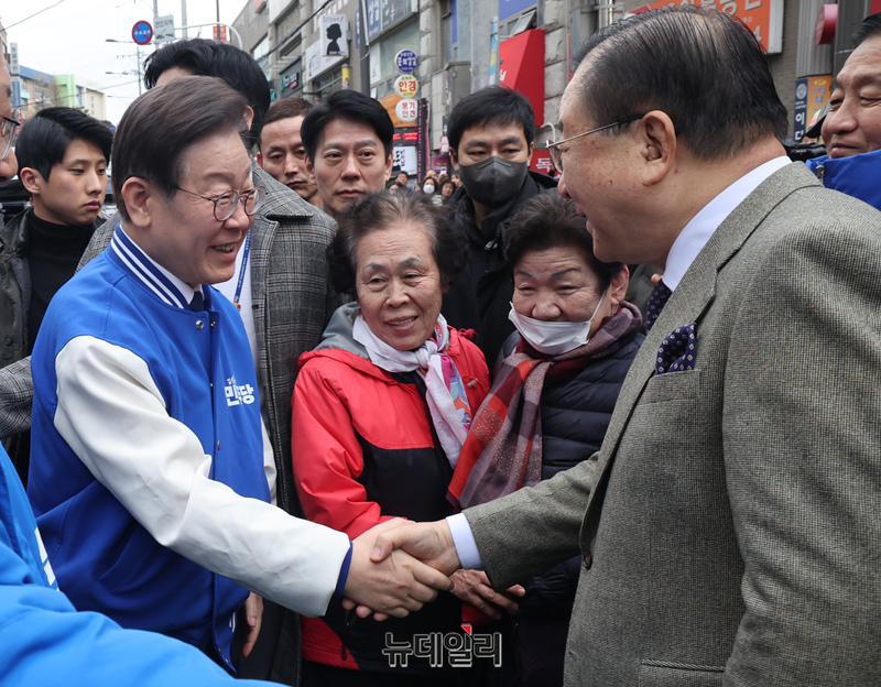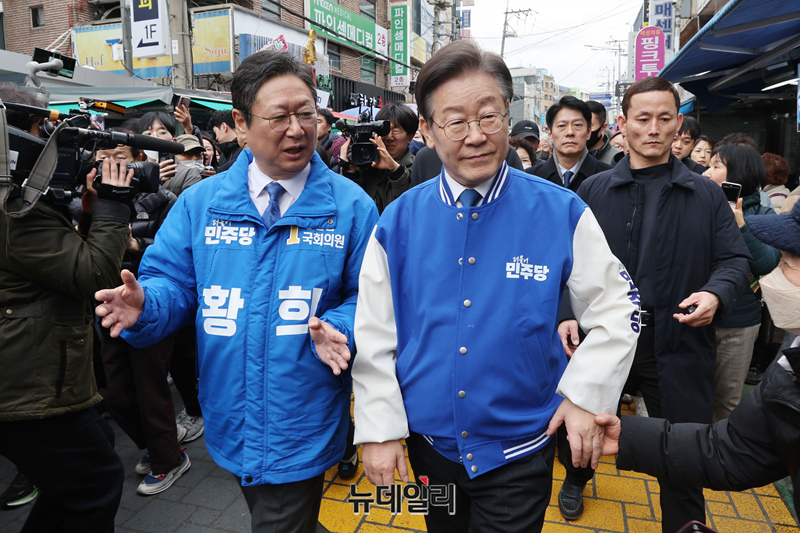 이재명 더불어민주당 대표와 황희 양천구갑 의원이 6일 서울 양천구 목동깨비시장에서 시민들을 향해 인사를 하고 있다.