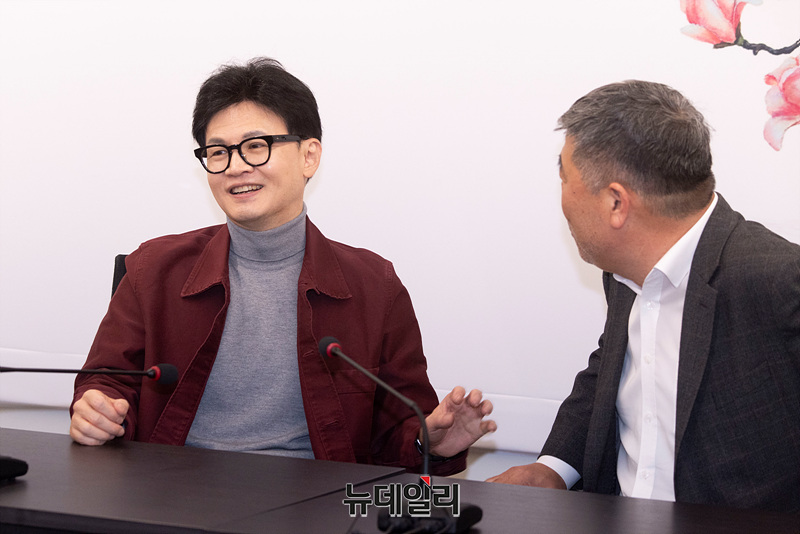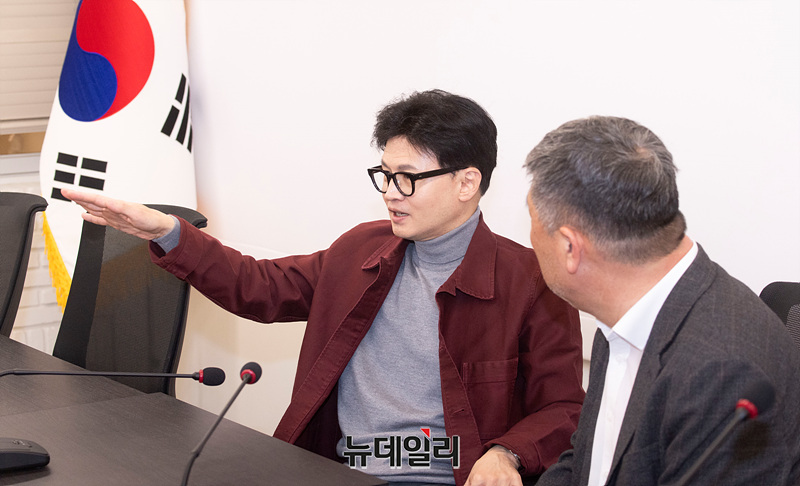 한동훈 국민의힘 비상대책위원장이 7일 오전 서울 여의도 중앙당사에서 김동명 한국노총 위원장과 대화를 나누고 있다.