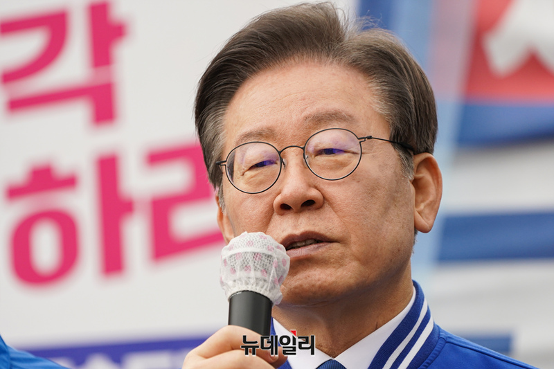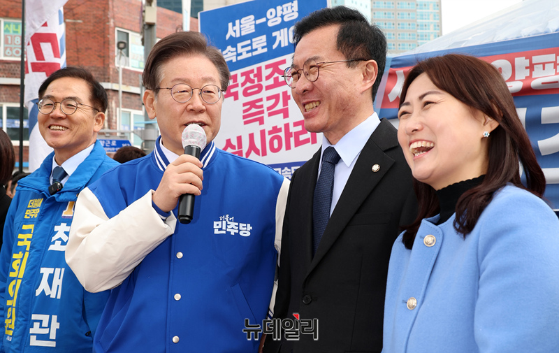 이재명 더불어민주당 대표가 7일 오전 경기 양평군 양평군청 앞 서울·양평 고속도로 국정농단 진상규명 촉구 농성장을 방문해 기자회견을 진행하고 있다.