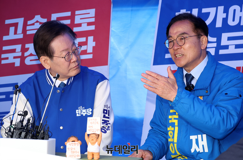 이재명 더불어민주당 대표가 7일 오전 경기도 양평군청 앞에 마련된 서울·양평 고속도로 국정농단 진상규명 촉구 농성장에서 총선 여주시·양평군에 출마한 최재관 후보 지지방문을 하고 있다.
