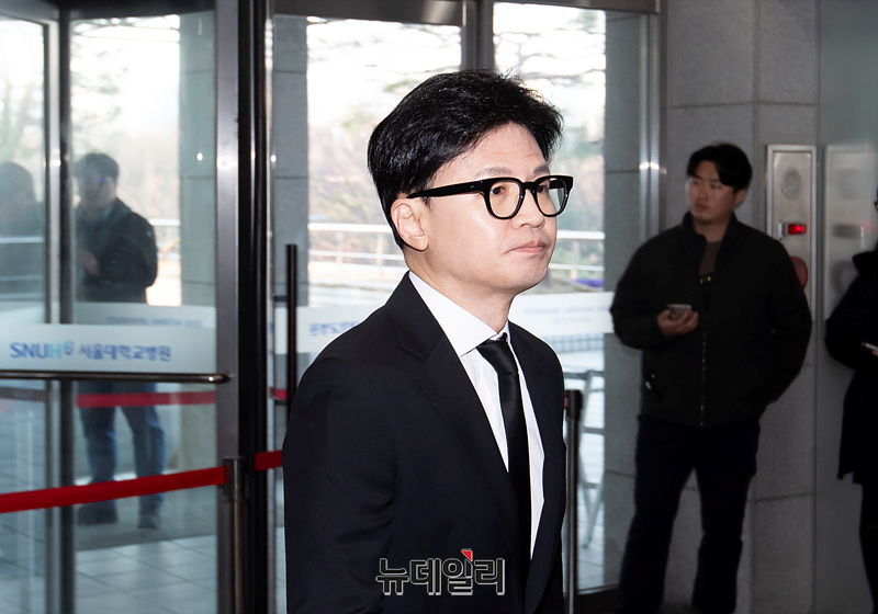 한동훈 국민의힘 비상대책위원장이 8일 오전 서울 종로구 서울대학교병원 장례식장에 마련된 김영삼 전 대통령 부인 손명순 여사 빈소를 향해 이동하고 있다.