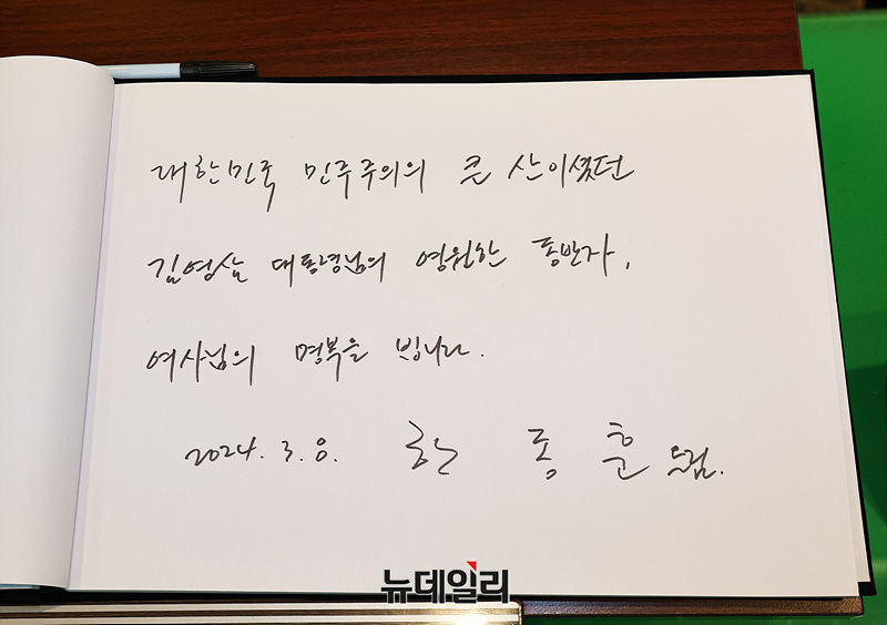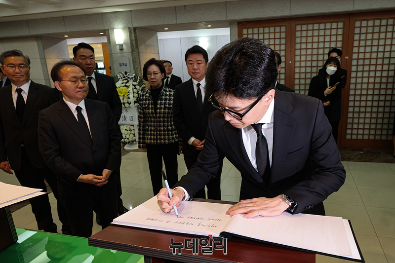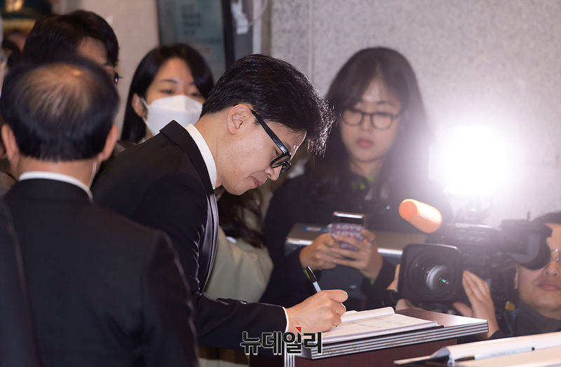 한동훈 국민의힘 비상대책위원장이 8일 오전 서울 종로구 서울대학교병원 장례식장에 마련된 김영삼 전 대통령 부인 손명순 여사 빈소를 찾아 방명록을 작성하고 있다.