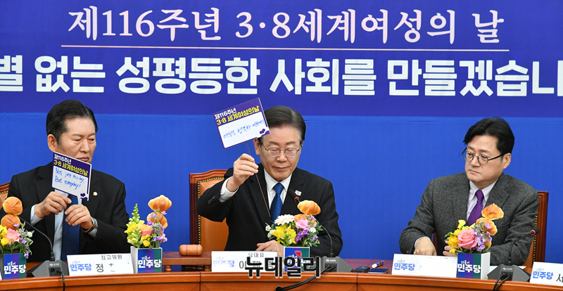이재명 더불어민주당 대표가 8일 오전 국회에서 열린 3.8 세계여성의날 기념행사에서 여성의날 메시지를 들고 있다.