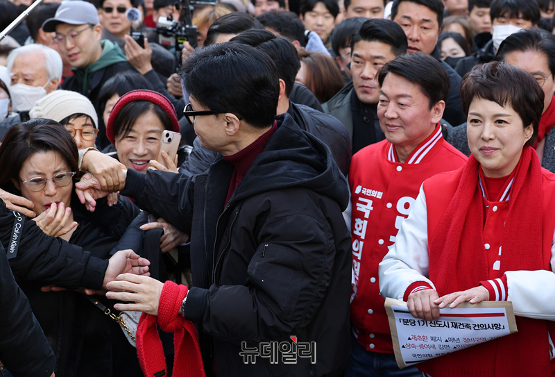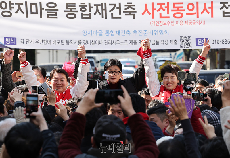 한동훈 국민의힘 비대위원장이 8일 오전 경기 성남시 분당구의 한 재건축 추진 아파트단지를 방문해 안철수, 김은혜 후보, 손석준 의원과 손을 맞잡고 지지자들에게 화답하고 있다. 이 단지는 이재명 더불어민주당 대표가 살던 곳이다. (경기 성남=정상윤 기자)