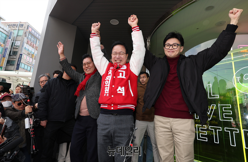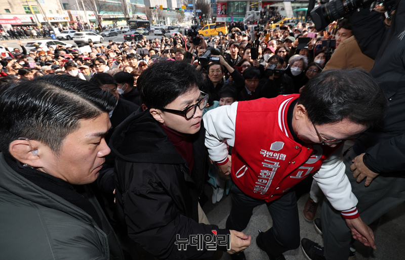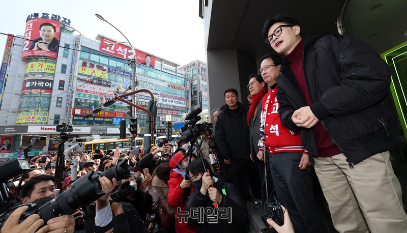 한동훈 국민의힘 비대위원장이 8일 오후 경기 용인시 수지구청역 사거리를 찾아 고석(용인병) 후보와 지지자들에게 인사말을 하고 있다. (경기 용인=정상윤 기자)