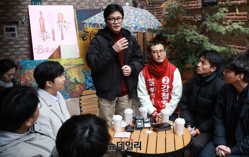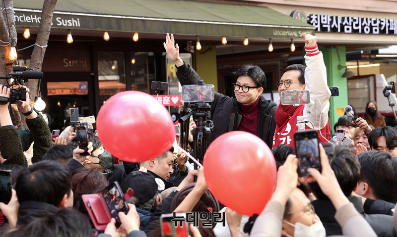 한동훈 국민의힘 비상대책위원장과 강철호(용인정) 후보가 8일 오후 경기 용인시 보정동 카페거리를 찾아 손을 잡고 시민들에게 인사를 하고 있다. (경기 용인=정상윤 기자)