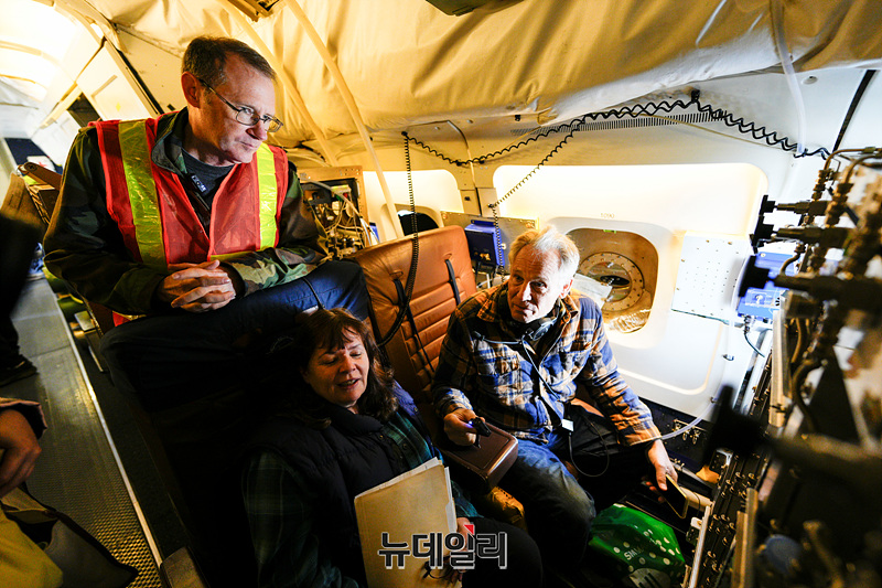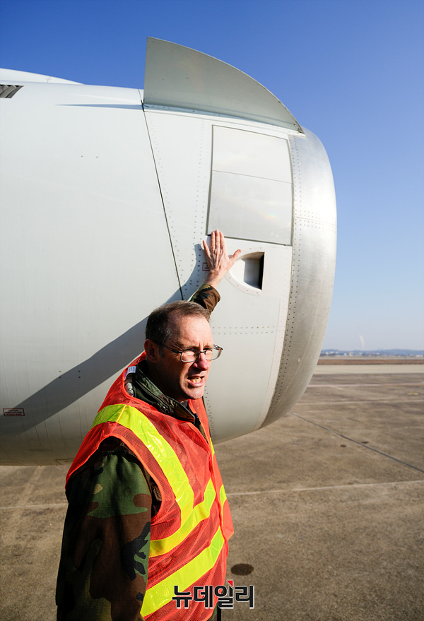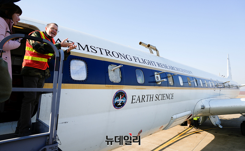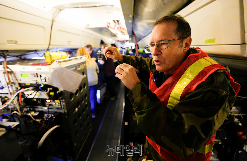 제임스 크로포드(James H Crawford) 미항공우주국(NASA) 선임연구원이 10일 오전 경기 평택 오산공군기지에서 연구용 항공기에 탑재된 장비를 설명하고 있다.이번 공동조사에서 DC-8 항공기는 세계최초 정지궤도 환경위성인 '천리안위성2B'의 아시아 관측 자료 검증을 위해 서울과 서해를 저공비행하며 동체 외부에 부착된 센서로 비교 데이터를 만들어 분석한다.2016년 제1차 대기질 국제 공동 조사와 이번 공동조사를 포함해 한국에서 두 번의 임무를 수행한 DC-8 항공기는 이번 임무를 마지막으로 퇴역할 예정이다. (경기 평택=서성진 기자)