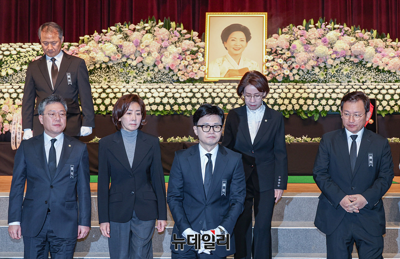 한동훈 국민의힘 비상대책위원장이 11일 오전 서울 동작구 국립서울현충원 현충관에서 열린 고 김영삼 전대통령 부인 손명순 여사의 영결식에서 헌화하고 있다.