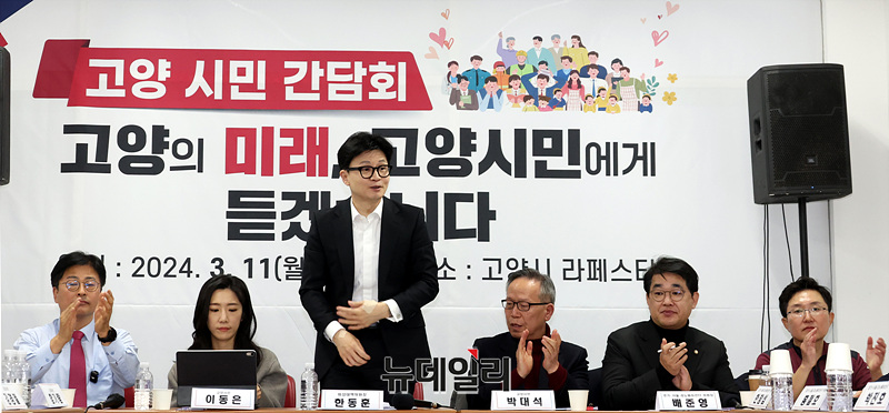한동훈 국민의힘 비상대책위원장이 11일 오후 경기 고양시 라페스타에서 열린 '경기-서울 리노베이션TF 경기 고양시 시민 간담회'에서 참석자들에게 인사를 하고 있다. (경기 고양=서성진 기자)