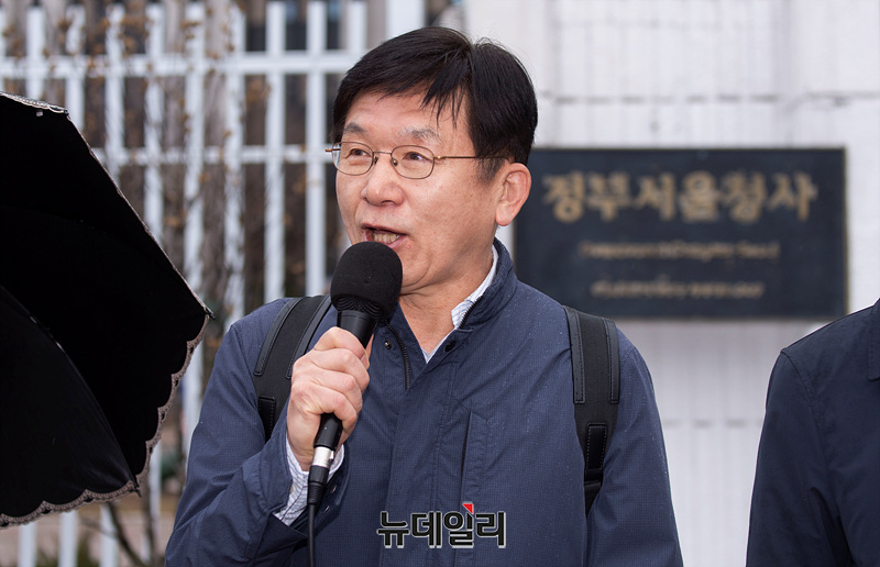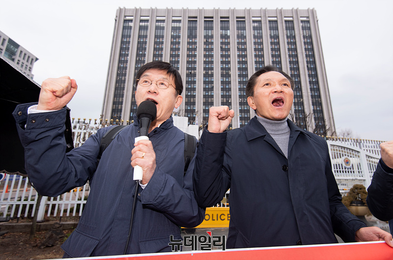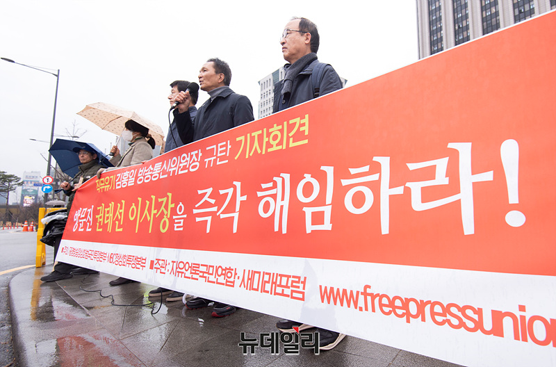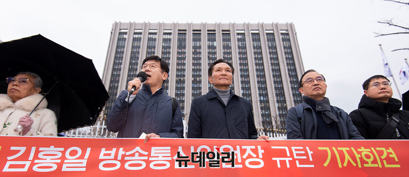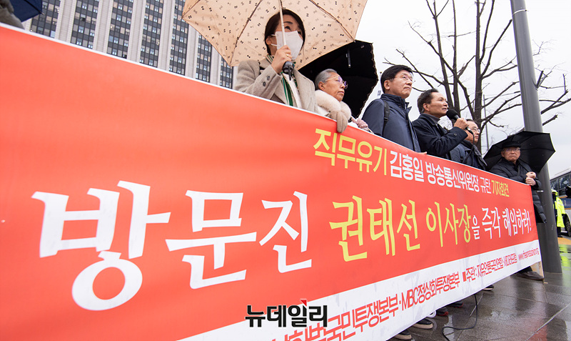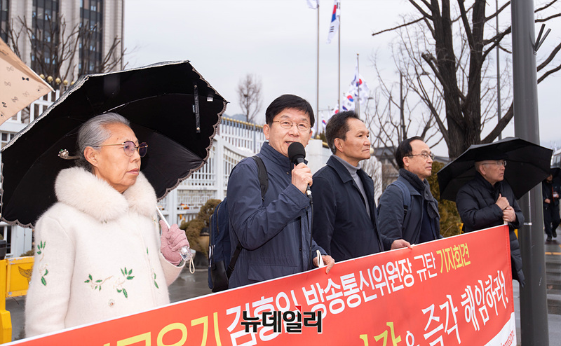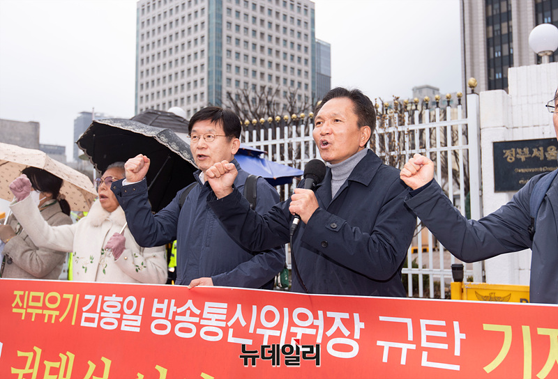 공영방송정상화범국민투쟁본부(상임공동본부장 이준용·이철영)가 12일 오전 서울 종로구 정부서울청사 앞에서 '김홍일 방송통신위원장 규탄' 기자회견을 열고, 권태선 방송문화진흥회 이사장 해임을 촉구하는 구호를 외치고 있다.이날 투쟁본부는 "김홍일 방통위원장이 MBC의 반 대한민국, 반 헌법, 불법적인 행태에 눈 감고 방조하고 있다"며 "△방통위, 권태선 방문진 이사장 즉각 해임 △방문진 이사 전원 사임 △MBC 법과 원칙에 따라 재허가 등을 진행 할 것"을 촉구했다.이들은 앞서 지난달 26일부터 MBC상암 사옥에서 MBC 정상화를 촉구하는 '조화 투쟁'에 돌입했다.