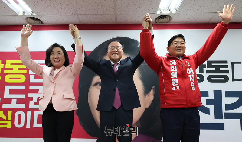 전주혜 국민의힘 강동갑 후보가 12일 오후 서울 강동구 선거사무실에서 열린 개소식에서 윤재옥 원내대표, 이재영(강동을) 후보와 손을 잡고 지지자들에게 인사를 하고 있다.