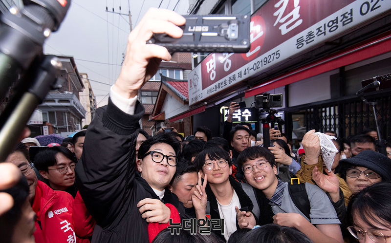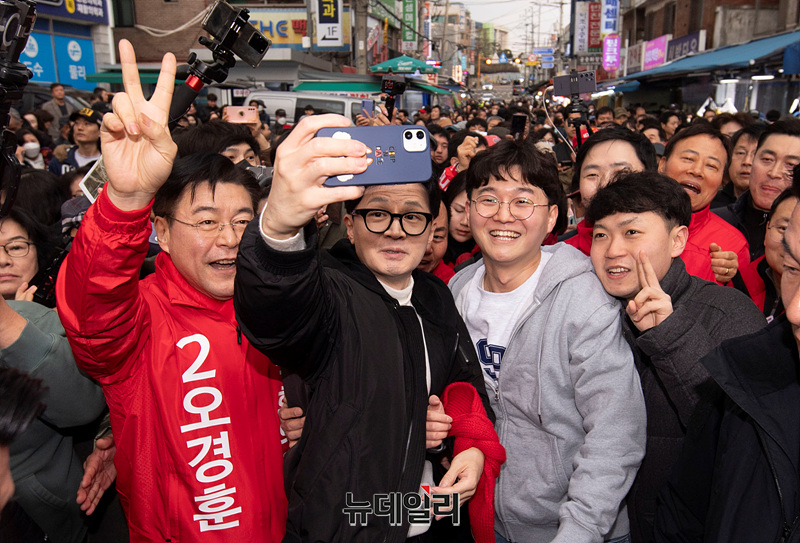 한동훈 국민의힘 비상대책위원장이 12일 오후 서울 양천구 목동깨비시장에서 시민들과 기념촬영을 하고 있다.