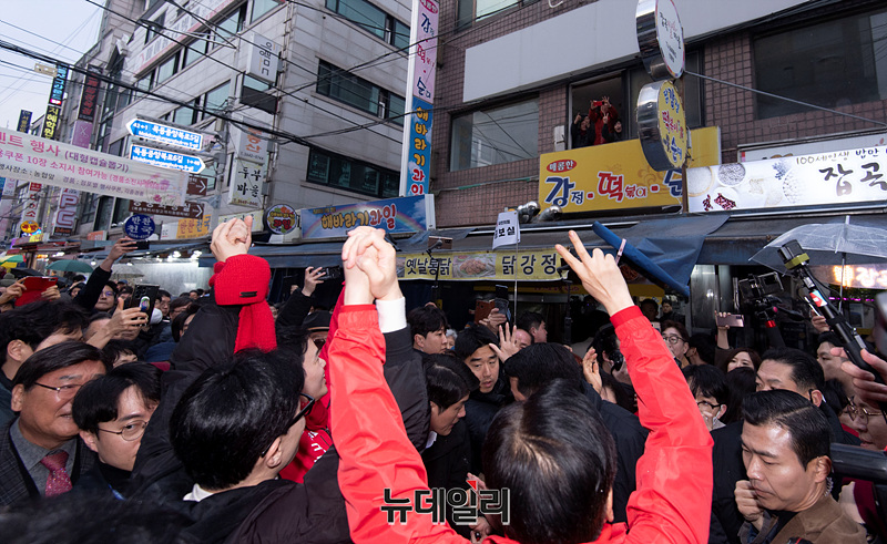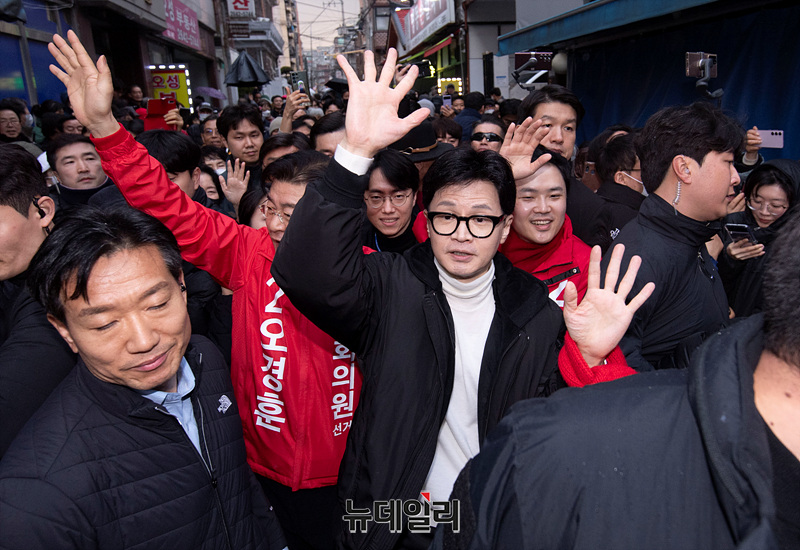 한동훈 국민의힘 비상대책위원장이 12일 오후 서울 양천구 목동깨비시장에서 양천갑을 구자룡, 오경훈 예비후보와 함께 시민들에게 인사하고 있다.