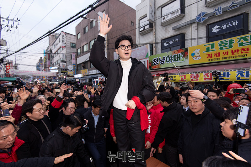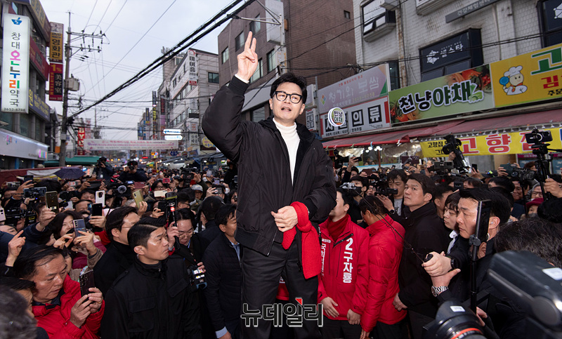 한동훈 국민의힘 비상대책위원장이 12일 오후 서울 양천구 목동깨비시장에서 시민들에게 지지를 호소하고 있다.