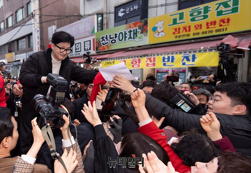 한동훈 국민의힘 비상대책위원장이 12일 오후 서울 양천구 목동깨비시장에서 지지자에게 싸인을 해주고 있다.