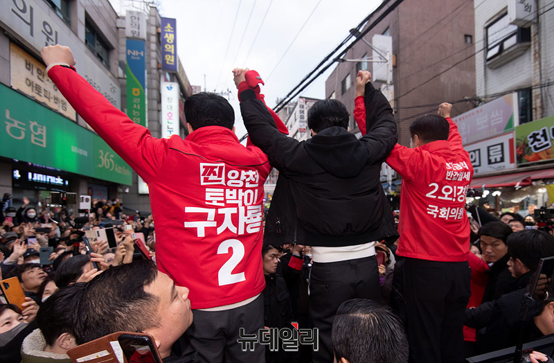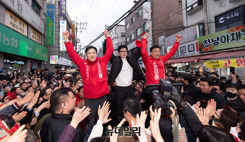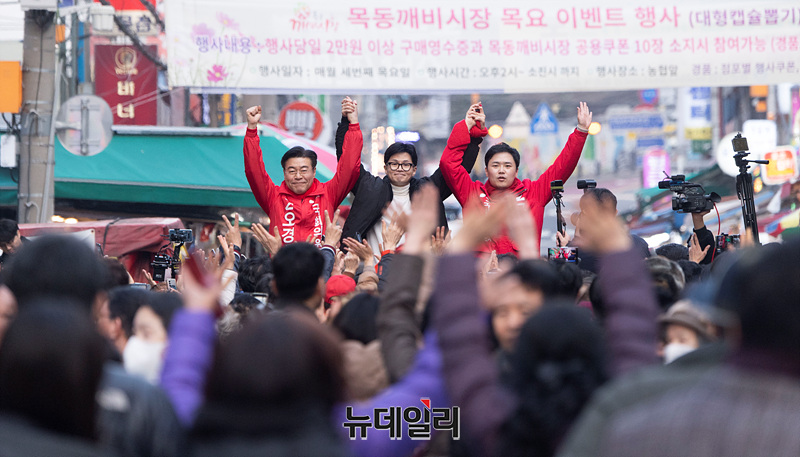 한동훈 국민의힘 비상대책위원장이 12일 오후 서울 양천구 목동깨비시장에서 양천갑을 구자룡, 오경훈 예비후보의 손을 잡고 시민들에게 인사하고 있다.
