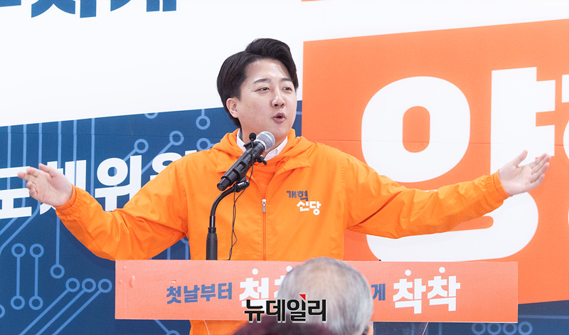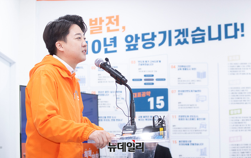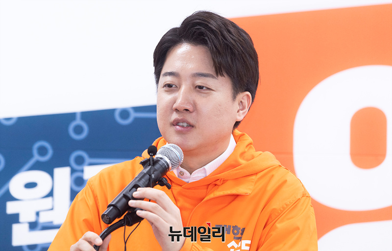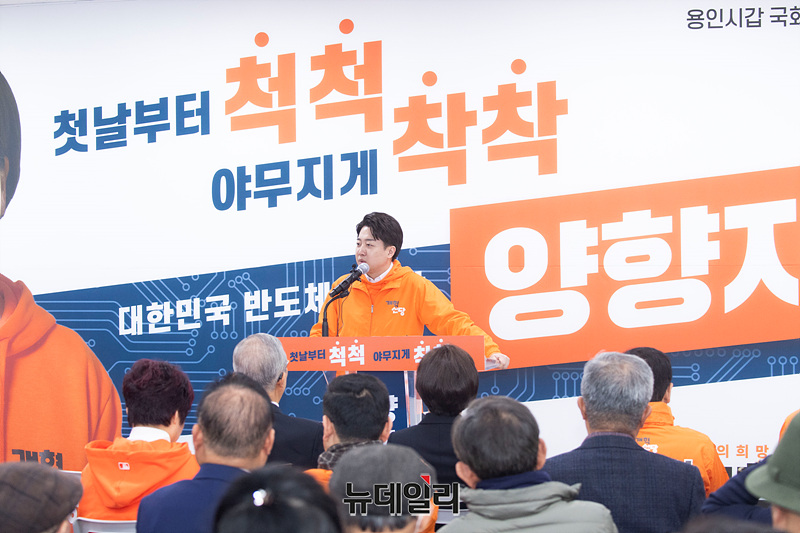이준석 개혁신당 대표가 13일 오전 경기 용인시 양향자 용인갑 예비후보 선거사무소에서 열린 개소식에서 축사를 하고 있다. (경기 용인=서성진 기자)