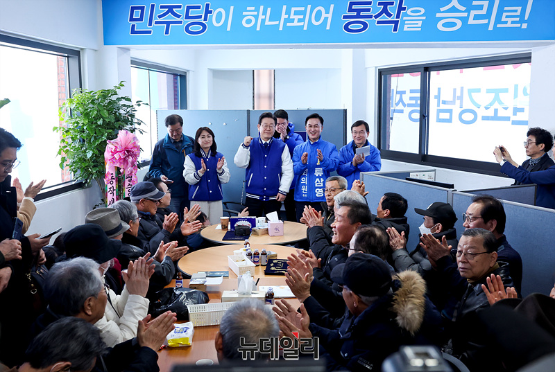 이재명 더불어민주당 대표가 13일 오후 서울 동작구 류삼영 동작을 예비후보 선거사무실을 방문하고 있다.