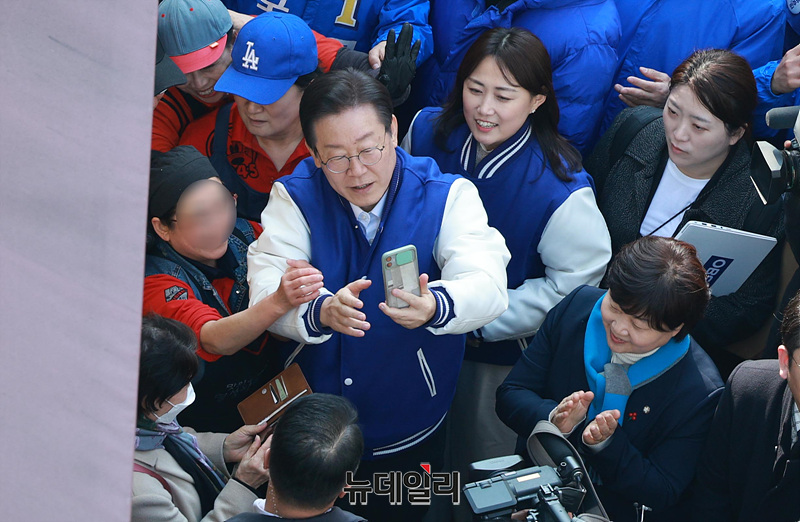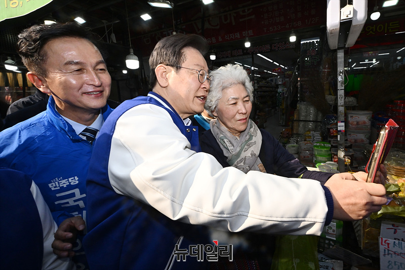 더불어민주당 이재명 대표가 13일 오후 서울 동작구 남성사계시장에서 시민과 기념촬영을 하고 있다.