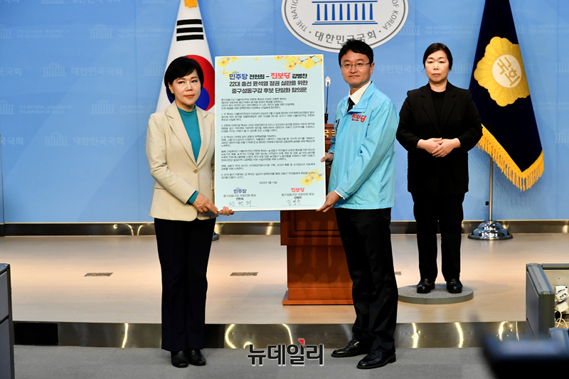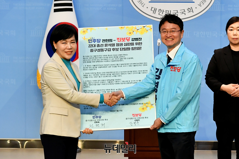 전현희 더불어민주당 서울 중·성동갑 후보와 진보당 강병찬 후보가 14일 국회 소통관에서 후보 단일화 합의문을 발표한 후 악수를 하고 있다.
