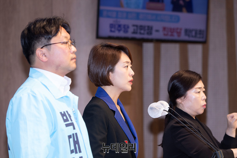 고민정 더불어민주당 의원과 박대희 진보당 광진을 예비후보가 14일 오후 국회 소통관에서 단일화 기자회견을 하고 있다.
