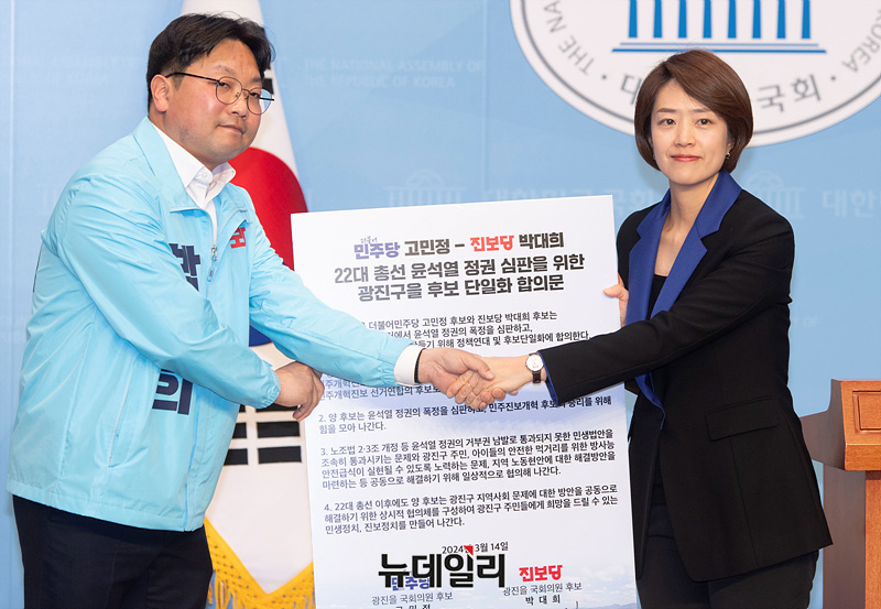 고민정 더불어민주당 의원과 박대희 진보당 광진을 예비후보가 14일 오후 국회 소통관에서 단일화 기자회견에서 합의문을 작성하고 있다.