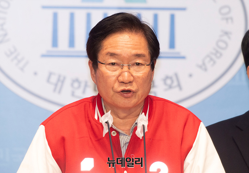 김영석 국민의힘 아산갑 예비후보가 14일 오후 국회 소통관에서 열린 아산시 갑을 원팀 선언 기자회견에서 발언하고 있다.