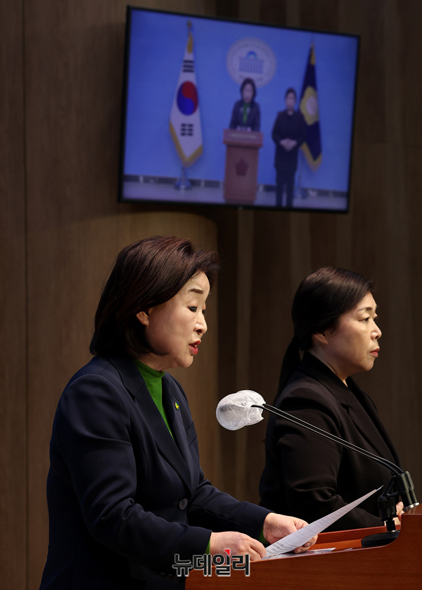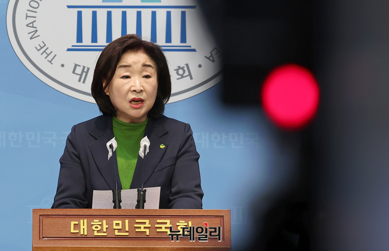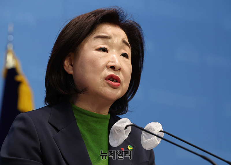 심상정 녹색정의당 원내대표가 14일 오후 국회 소통관에서 양당의 위성정당을 비판하는 기자회견을 하고 있다.