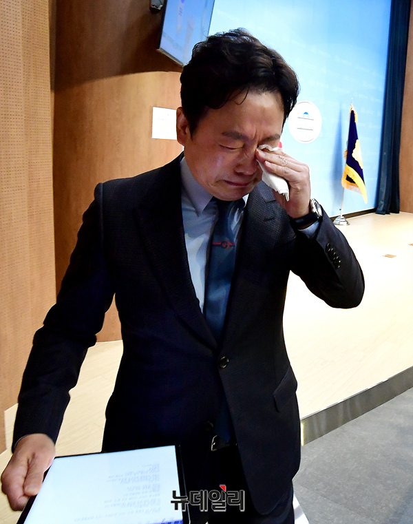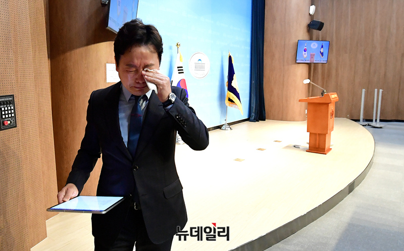 막말 논란으로 더불어민주당 서울 강북을 공천이 취소된 정봉주 전 후보가 18일 오전 국회 소통관에서 입장 발표 후 눈물을 흘리며 퇴장하고 있다.정 전 후보는 지난 2017년 7월 자신의 팟캐스트에서 평창동계올림픽과 관련, 북한 스키장 활용 방안을 놓고 패널들과 대화하다 "DMZ(비무장지대)에 멋진 거 있잖아요? 발목지뢰. DMZ에 들어가서 경품을 내는 거야. 발목지뢰 밟는 사람들한테 목발 하나씩 주는 거야" 라고 말해 논란이 됐다.논란이 확산하자 "과거 발언 직후 당사자께 직접 유선상으로 사과드리고 관련 영상 등을 즉시 삭제했다"고 밝혔지만 북한 지뢰에 다리를 잃은 당사자들은 "아무런 연락을 받은 적 없다"고 밝혀 거짓 논란까지 일었다.