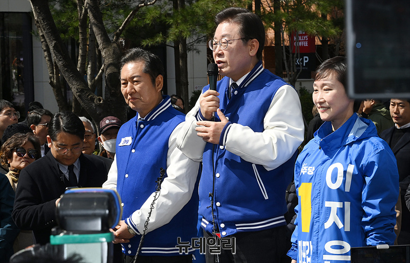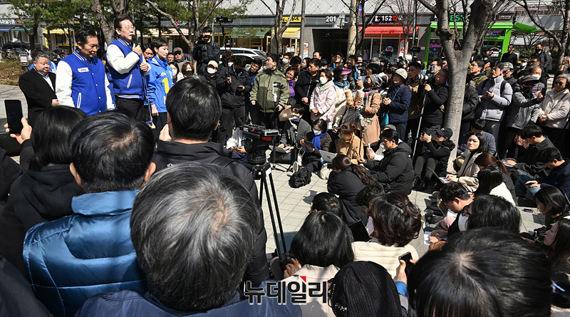 이재명 더불어민주당 상임공동선거대책위원장이 18일 서울 마포구 경의선숲길에서 현장 기자회견에서 발언하고 있다.
