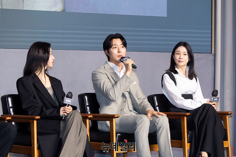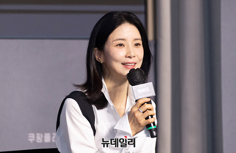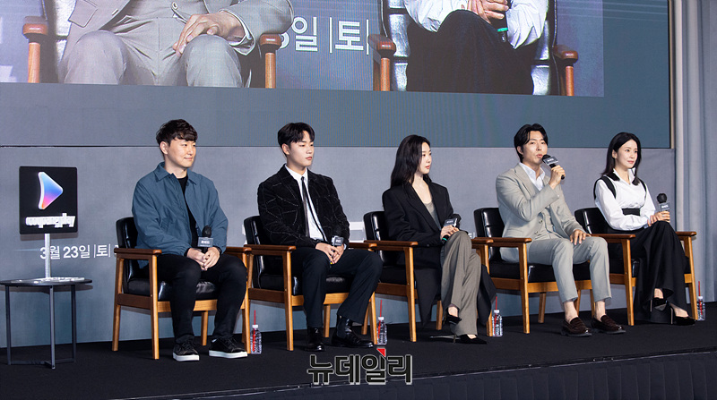 김동휘 감독(왼쪽부터), 배우 이민재, 이청아, 이무생, 이보영이 19일 오전 서울 강남구 조선팰리스에서 열린 쿠팡플레이 시리즈 '하이드(감독 김동휘)' 제작발표회에서 소감을 밝히고 있다.