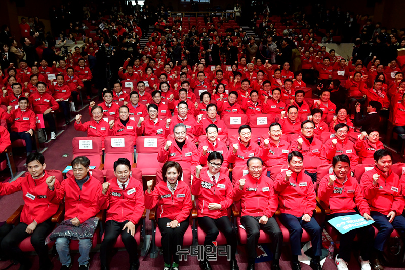 한동훈 국민의힘 총괄선대위원장 및 참석자들이 19일 오전 국회 의원회관에서 열린 제22대 총선 중앙선대위 발대식 및 공천자대회에 참석해 승리를 다짐하고 있다.