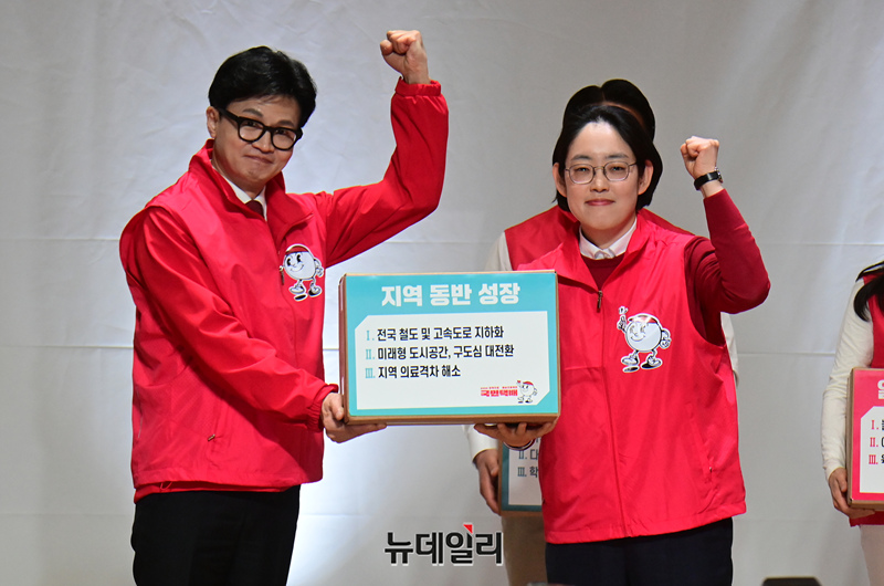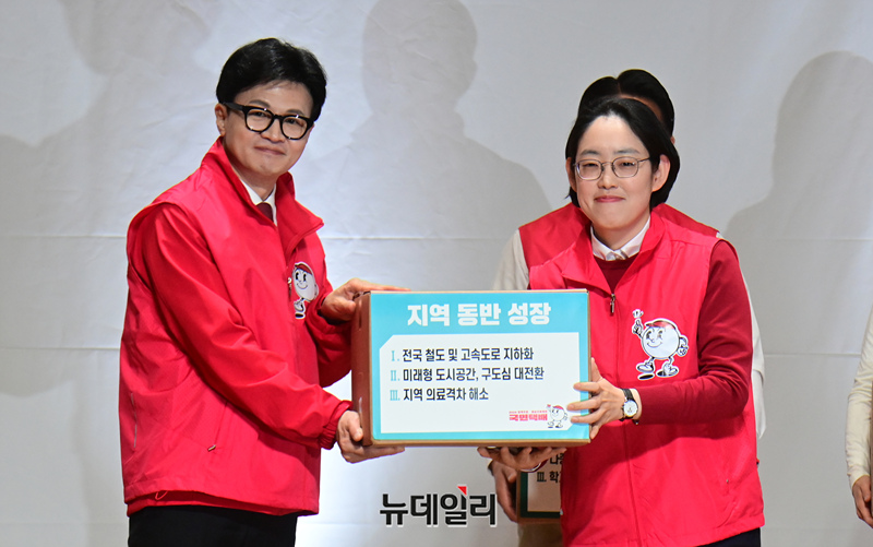 [포토] 한동훈 대표에게 국민택배 받은 조지연 후보
