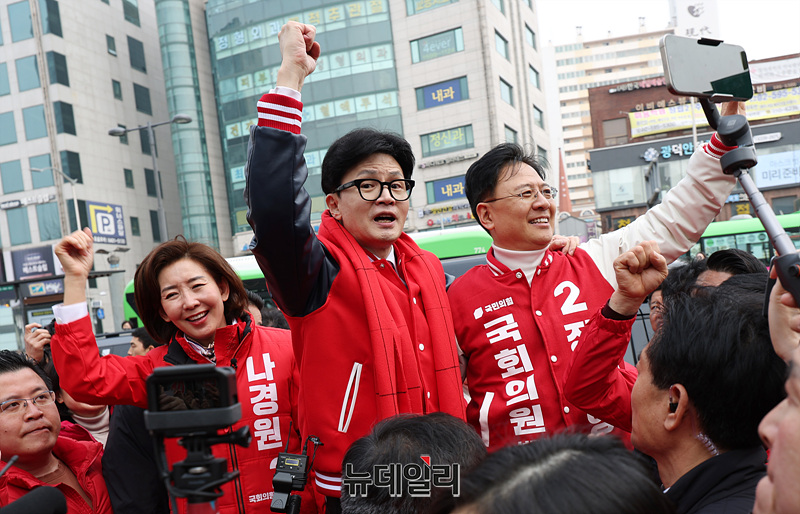 한동훈 국민의힘 비상대책위원장 겸 총괄선거대책위원장이 19일 오후 서울 동작구 남성사계시장에서 동작갑 장진영 후보, 나경원 동작을 후보와 함께 시민들에게 인사하고 있다.