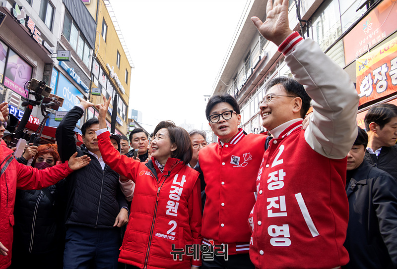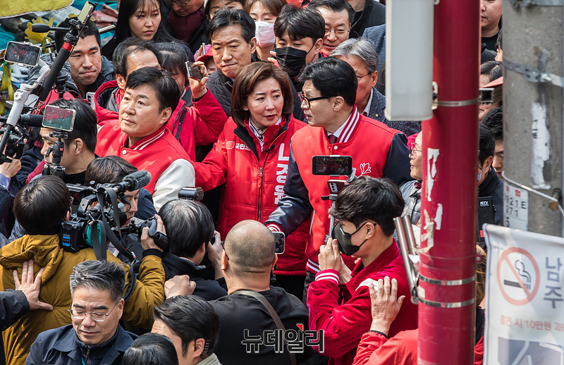 한동훈 국민의힘 비상대책위원장 겸 총괄선거대책위원장이 19일 오후 서울 동작구 남성사계시장에서 장진영 동작갑 후보, 나경원 동작을 후보와 함께 시민들에게 인사를 하고 있다.