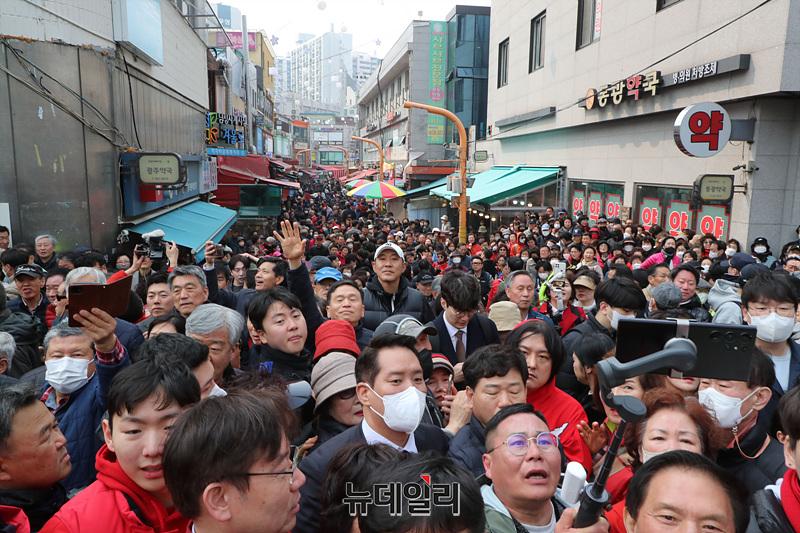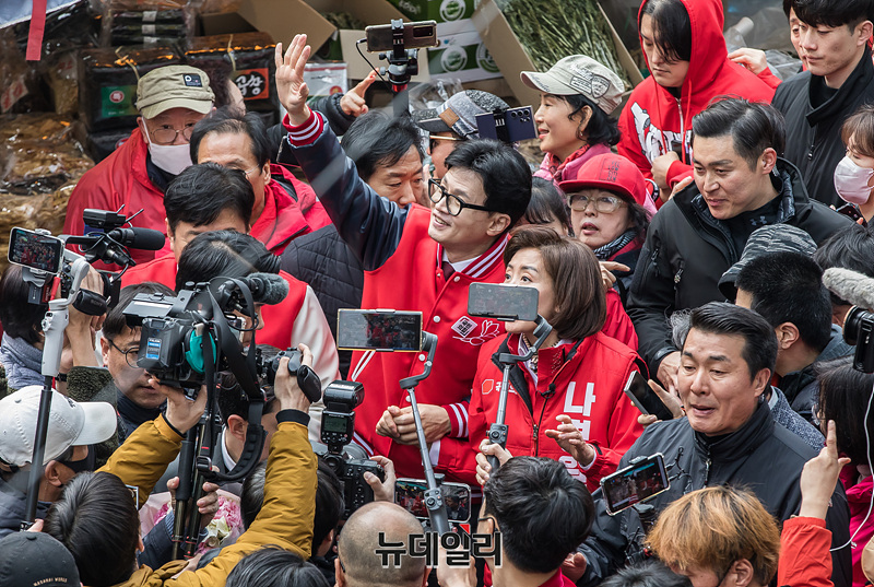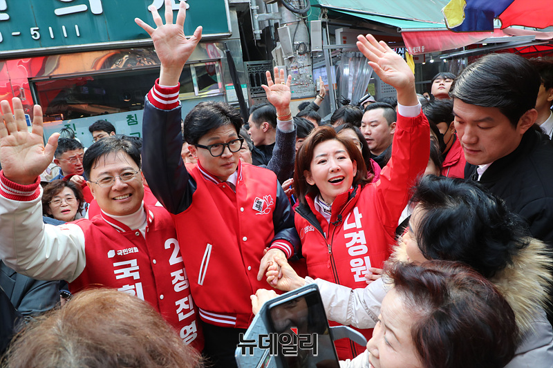 한동훈 국민의힘 비상대책위원장 겸 총괄선거대책위원장이 19일 오후 서울 동작구 남성사계시장에서 장진영 동작갑 후보, 나경원 동작을 후보와 함께 시민들에게 인사하고 있다.