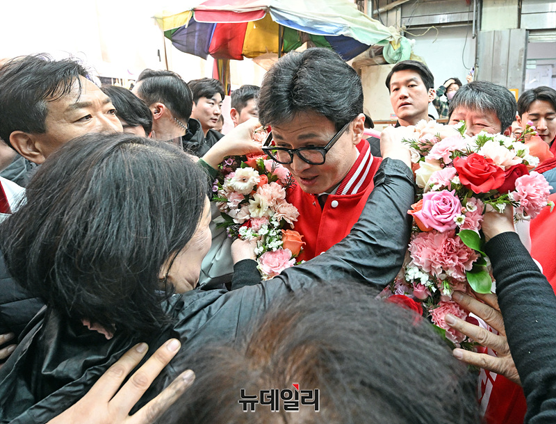 한동훈 국민의힘 비상대책위원장 겸 총괄선거대책위원장이 19일 오후 서울 서대문구 인왕시장에서 꽃 목걸이를 선물받고 있다.