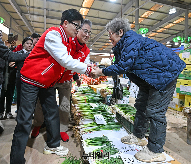 한동훈 국민의힘 비상대책위원장 겸 총괄선거대책위원장이 19일 오후 서울 서대문구 인왕시장에서 이용호 서대문갑 후보, 박진 서대문을 후보와 함께 시장 상인들에게 인사하고 있다.