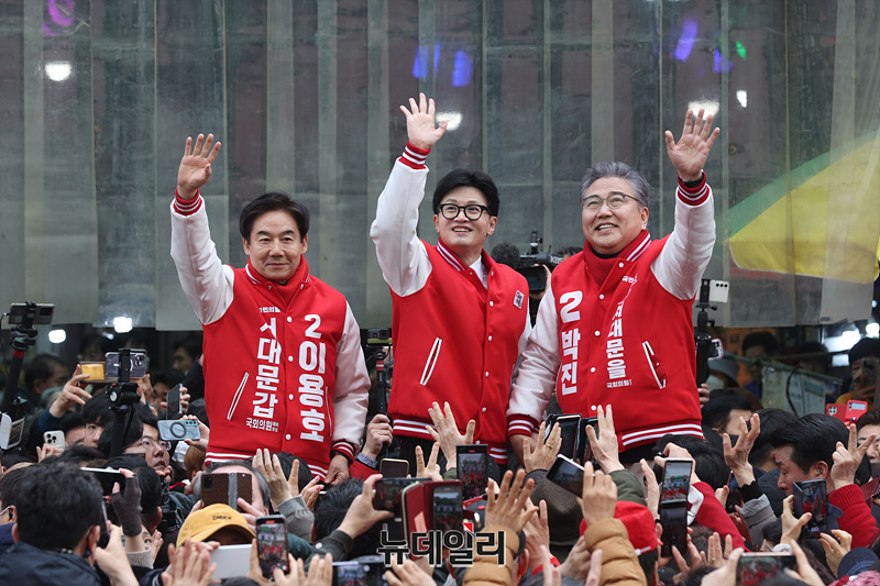 한동훈 국민의힘 비상대책위원장 겸 총괄선거대책위원장이 19일 오후 서울 서대문구 인왕시장에서 이용호 서대문갑 후보, 박진 서대문을 후보와 함께 시민들에게 인사하고 있다.