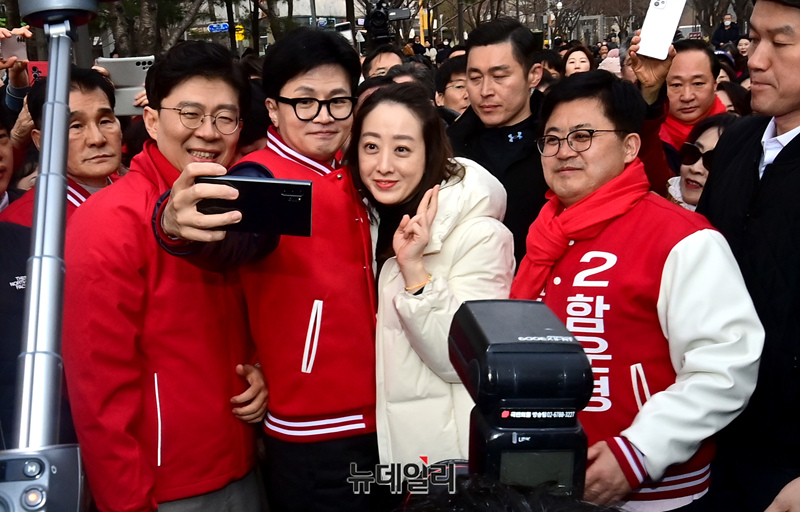 한동훈 국민의힘 비상대책위원장이 19일 서울 마포구 경의선숲길에서 지지자들과 사진을 찍고 있다.