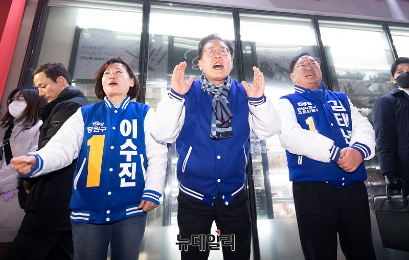 이재명 더불어민주당 상임공동선거대책위원장이 19일 오후 경기 성남시 모란역 인근에서 시민들에게 지지를 호소하고 있다. (경기 성남=서성진 기자)