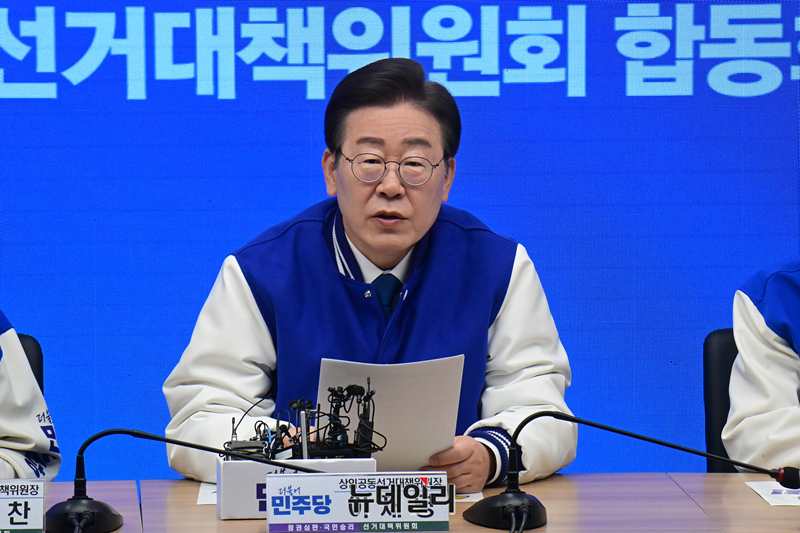 이재명 더불어민주당 상임공동선대위원장이 20일 오전 서울 여의도 민주당 중앙당사에서 열린 더불어민주당-더불어민주연합 중앙선거대책위원회 합동회의에서 발언을 하고 있다.