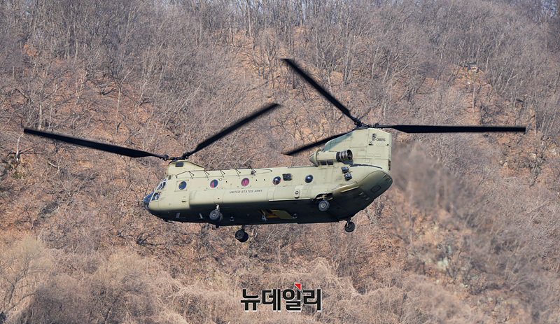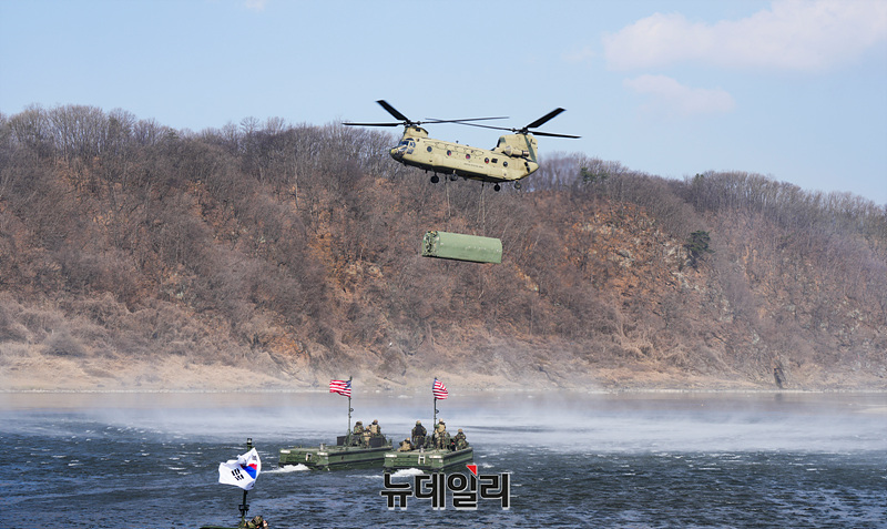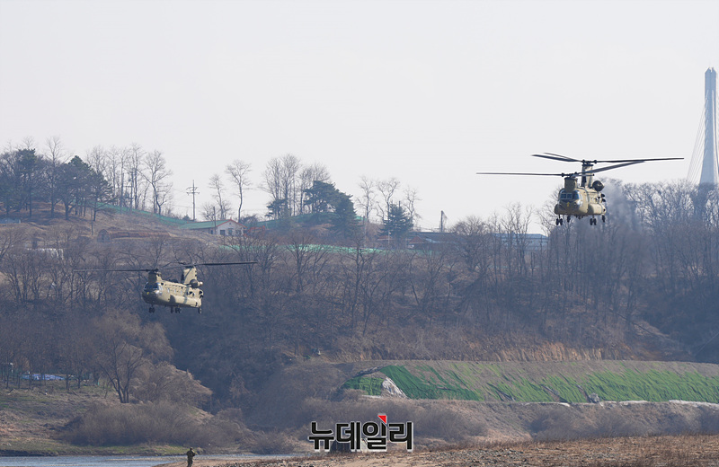 미 육군 시누크 수송헬기(CH-47D)가 20일 오전 경기 연천군 임진강 일대에서 진행된 한미연합 제병협동 도하훈련에서 부교를 수송하고 있다.이날 훈련은 한미연합 공병정찰을 시작으로 항공수송을 통한 연합부교 구축, 기동부대 부교 도하 순으로 진행됐다.훈련에는 5공병여단을 포함해 5군단 항공·방공단과 화생방대대, 5기갑여단 전차중대, 1항공여단 301항공대대, 미2사단 11공병대대 등 약 470여명의 장병과 리본부교(RBS), 미군 개량형 전술부교(IRB), 공병장비 65대와 시누크(CH-47D), 아파치(AH-64E), K1E1 전차 등 장비가 투입됐다. (경기 연천=서성진 기자)