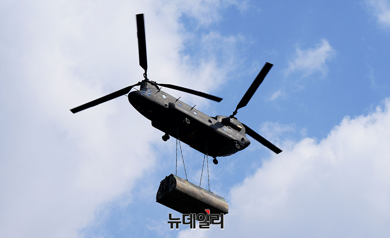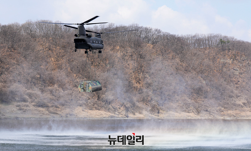 대한민국 육군 시누크(CH-47D) 수송헬기가 20일 오전 경기 연천군 임진강 일대에서 진행된 한미연합 제병협동 도하훈련에서 부교를 수송하고 있다.이날 훈련은 한미연합 공병정찰을 시작으로 항공수송을 통한 연합부교 구축, 기동부대 부교 도하 순으로 진행됐다.훈련에는 5공병여단을 포함해 5군단 항공·방공단과 화생방대대, 5기갑여단 전차중대, 1항공여단 301항공대대, 미2사단 11공병대대 등 약 470여명의 장병과 리본부교(RBS), 미군 개량형 전술부교(IRB), 공병장비 65대와 시누크(CH-47D), 아파치(AH-64E), K1E1 전차 등 장비가 투입됐다. (경기 연천=서성진 기자)