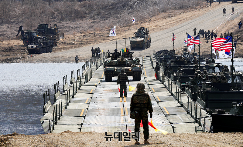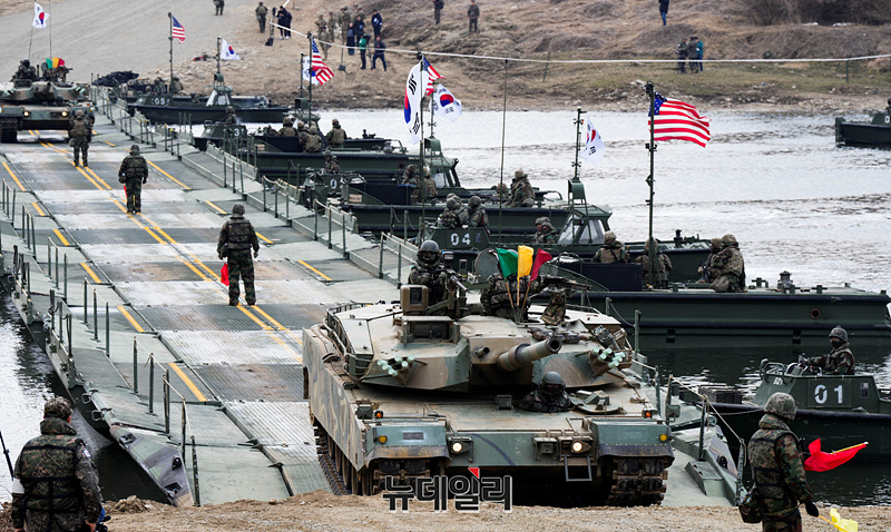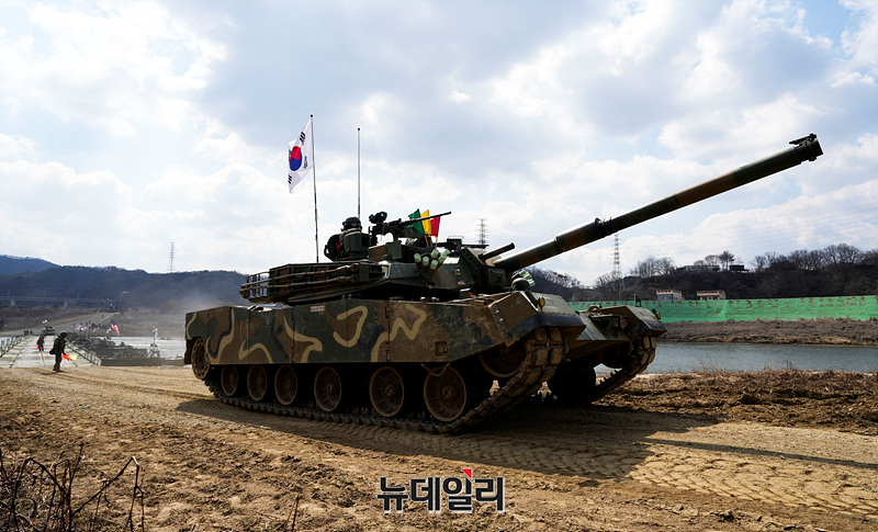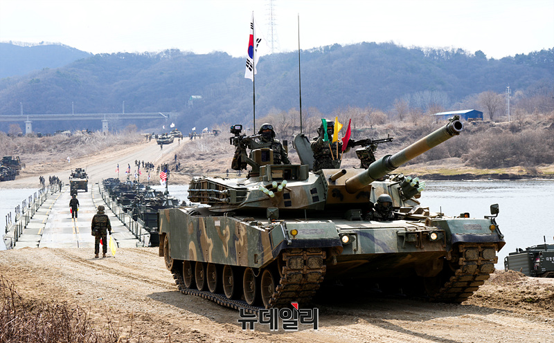 대한민국 육군 K1E1 전차가 20일 오전 경기 연천군 임진강 일대에서 진행된 한미연합 제병협동 도하훈련에서 부교를 건너고 있다.이날 훈련은 한미연합 공병정찰을 시작으로 항공수송을 통한 연합부교 구축, 기동부대 부교 도하 순으로 진행됐다.훈련에는 5공병여단을 포함해 5군단 항공·방공단과 화생방대대, 5기갑여단 전차중대, 1항공여단 301항공대대, 미2사단 11공병대대 등 약 470여명의 장병과 리본부교(RBS), 미군 개량형 전술부교(IRB), 공병장비 65대와 시누크(CH-47D), 아파치(AH-64E), K1E1 전차 등 장비가 투입됐다. (경기 연천=서성진 기자)