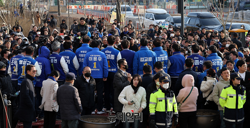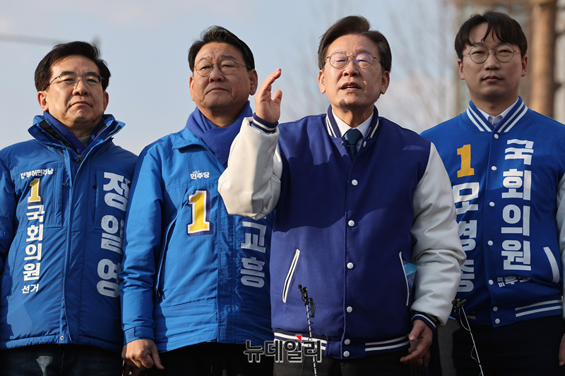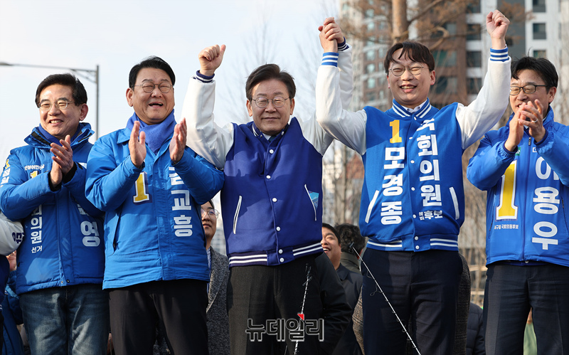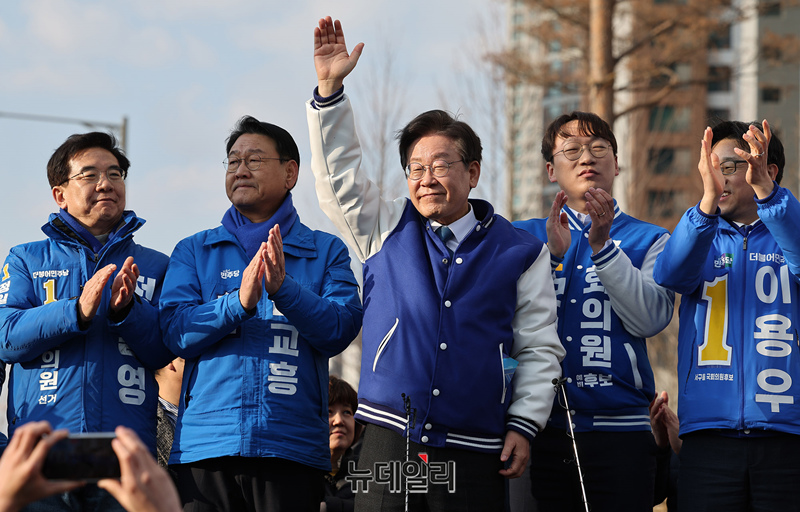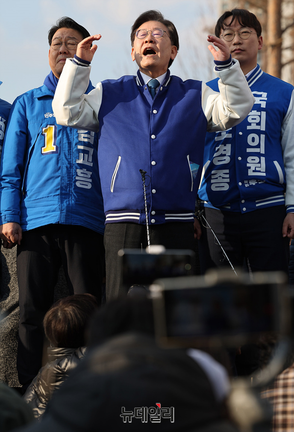 이재명 더불어민주당 상임선대위원장이 20일 오후 인천 서구 정서진중앙시장을 방문해 인천지역 후보들과 지지호소를 하고 있다. (인천=정상윤 기자)