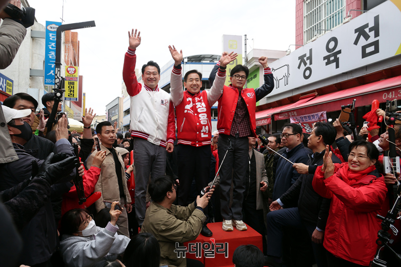 한동훈 국민의힘 비상대책위원장 정용선 후보, 장동혁 사무총장이 22일 충남 당진전통시장을 찾아 시민들에게 인사를 하고 있다. (충남 당진=이종현 기자)