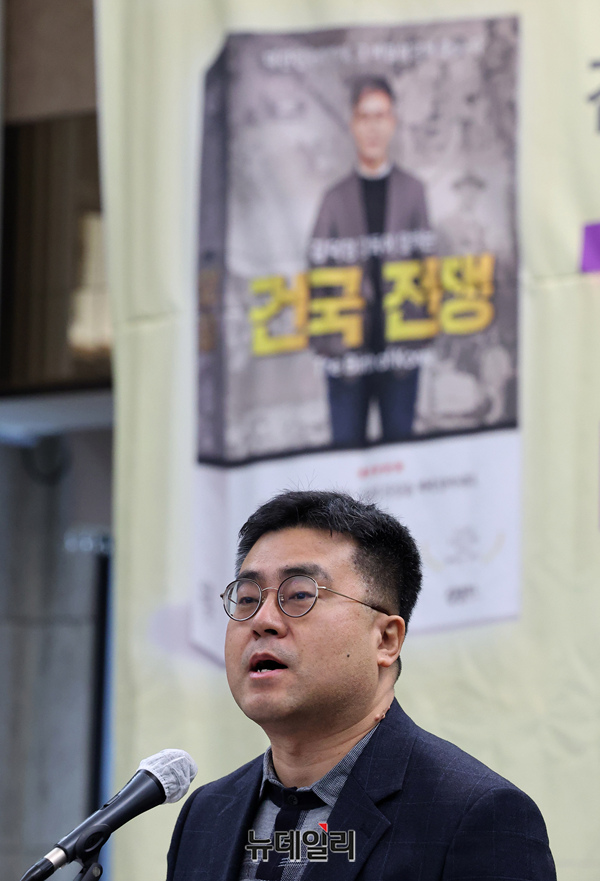 거룩한대한민국네트워크 이호 목사가 22일 오후 서울 중구 한국프레스센터에서 열린 저서 '김덕영 감독이 말하는 건국전쟁' 출판기념회에서 축사를 하고 있다.