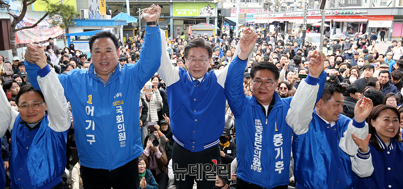 이재명 더불어민주당 대표겸 상임공동선대위원장이 22일 오후 충남 당진시장에서 지지를 호소하고 있다. (충남 당진=서성진 기자)